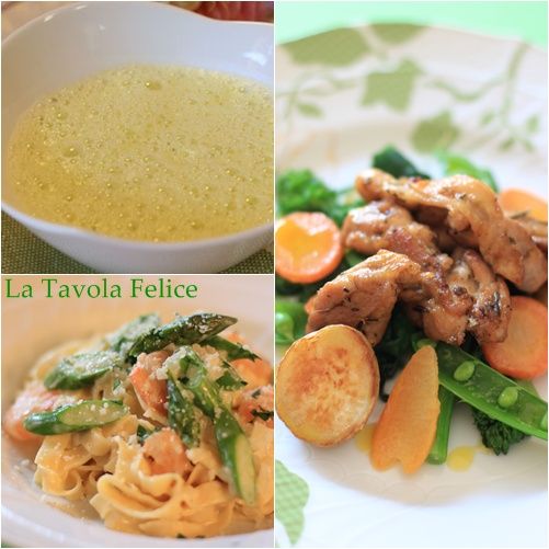 前回のレッスンを好評いただきましたので、4月に、第2回目東京レッスンを開催させていただくことになりましたメニューそら豆のスープ カプチーノ仕立てアスパラと海老のクリームソース フェットゥッチーネ(生パスタ)チキンのソテー ハーブビネガー風味 春野菜添え